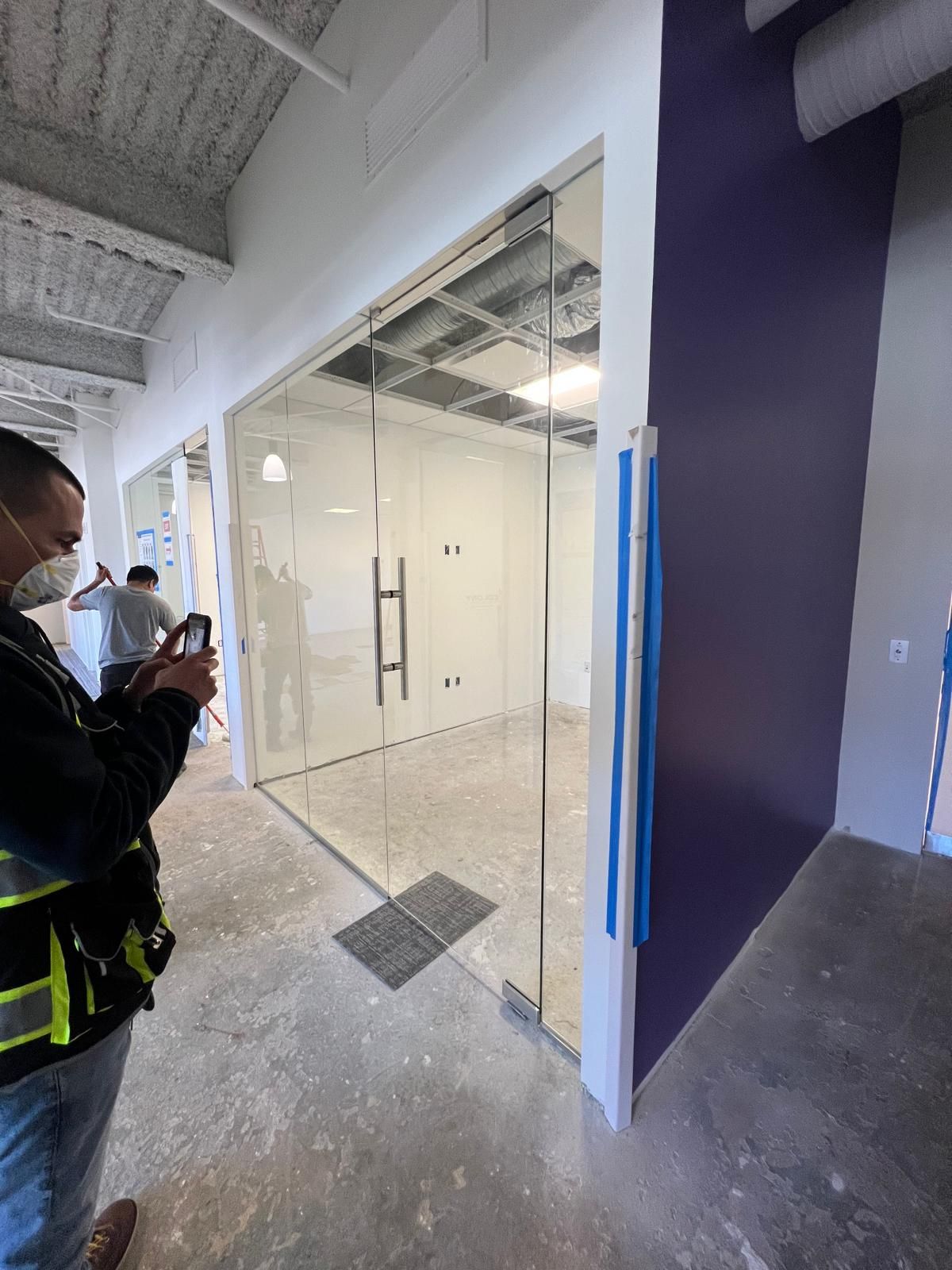 At this job, we were called to create quiet meeting rooms without sacrificing natural light. We installed frameless glass partitions with discreet channels, added acoustic interlayers / STC-rated film where needed, and applied a tasteful privacy band so meetings stay private but the office still feels open. Soft-close sliders, ADA pulls, and careful alignment around sprinklers and HVAC kept everything code-compliant. The team gained real privacy and a premium, modern office with zero drywall dust.